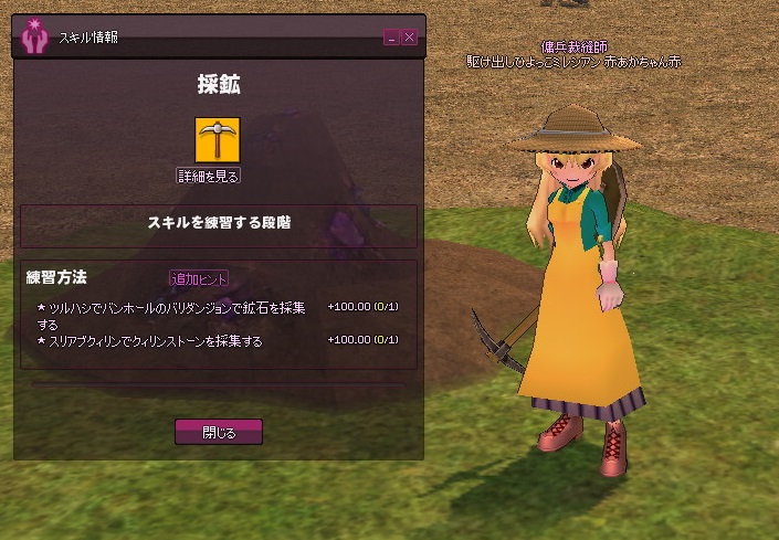 ツルハシを装備すると、採鉱というスキルが入手できます。