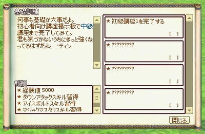マスターティンの講座をクリアすると、「基礎訓練」クエストがもらえます。