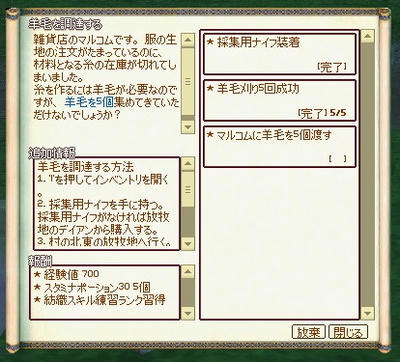 しばらくぼーっとして待っていると、「羊毛を調達する」クエストがもらえます。