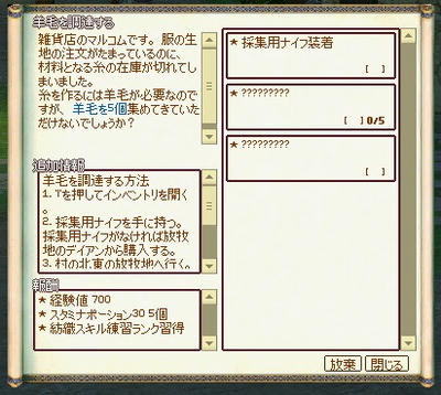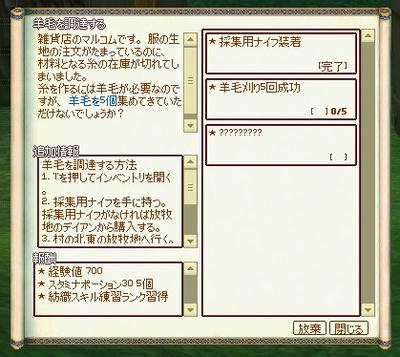 しばらくぼーっとして待っていると、「羊毛を調達する」クエストがもらえます。